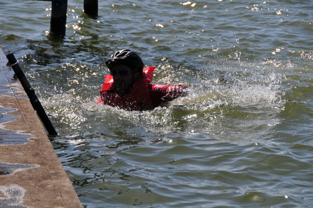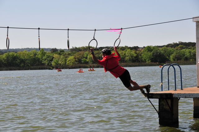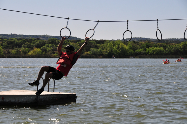 I heard someone yell for me to keep my PFD on when I exited the boat. I did, and I followed the route to the final mystery event--a set of rings over the lake with only a platform at the beginning... water at the other end.