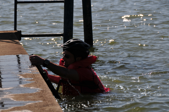 I'd given a lot of thought to transitioning from the run to the boat to the bike. Basically, my bike was on the other side of the lake. Me and all my gear weren't. I had to paddle this inflatable piece-of-crap kayak 0.4 miles from one side of the lake to the other with all my gear--helmet, gloves, shoes, Camelbak, water, food, etc.
